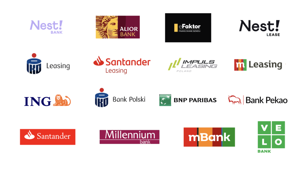 W F-Finance współpracujemy z zaufanymi instytucjami finansowymi, aby zapewnić naszym klientom możliwie najszerszą i najbardziej konkurencyjną ofertę. W naszej bazie znajdują się banki, firmy leasingowe oraz instytucje pozabankowe, które gwarantują sprawdzone rozwiązania dopasowane do różnych potrzeb — od kredytów gotówkowych i hipotecznych, po finansowanie firm i leasing. Poniżej prezentujemy naszych partnerów, których produkty i usługi są dostępne w ofercie F-Finance. Dzięki tej współpracy możemy zapewnić naszym klientom przejrzystość, elastyczność oraz najlepsze warunki na rynku.